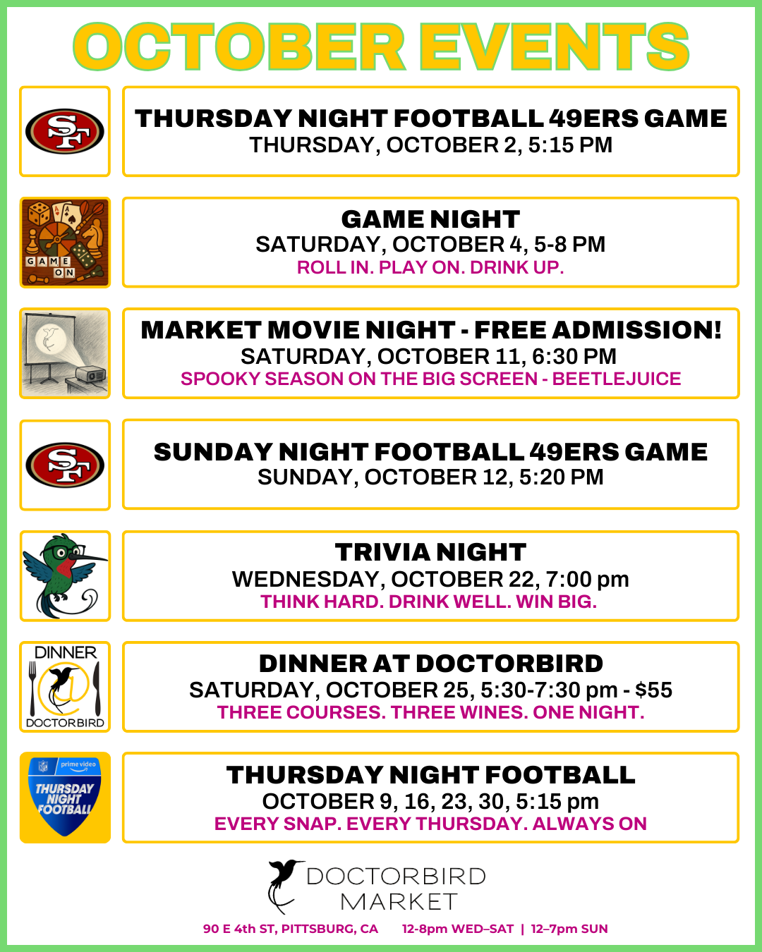 Doctorbird Market is a family-run bottle shop and wine lounge in Old Town Pittsburg, CA featuring small-production wine, craft beer, and specialty foods. We are here to serve our community and encourage our neighbors to live deliciously!